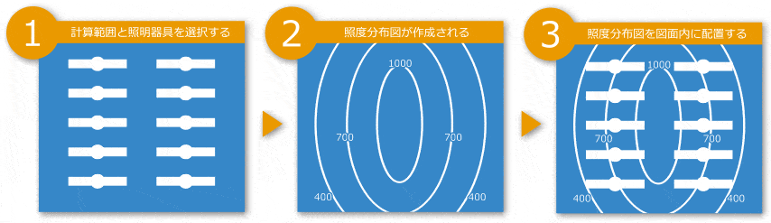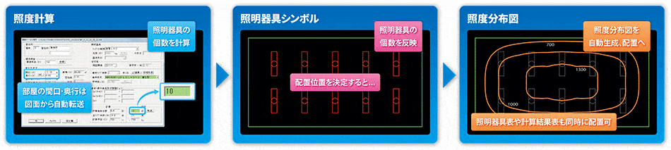 「照度計算書」で算出した器具台数を図面に反映して照明器具シンボルを配置し、照度分布図を自動生成して配置するまでをほんの数クリックで実現する、便利な連携機能も搭載しています。