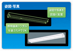 照明器具の姿図(CADデータ)や写真(画像データ)の貼付けにも対応しています。