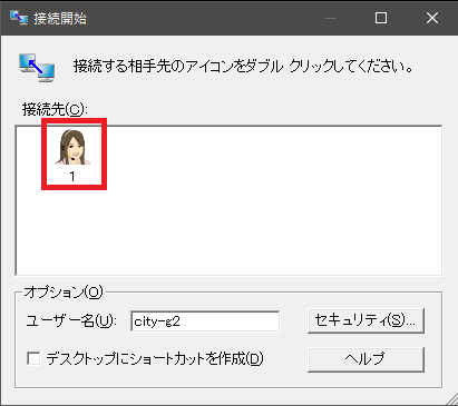 接続開始ダイアログが表示されますので、接続先欄内にあるアイコンを左クリックしてください。